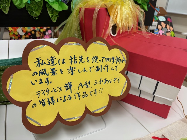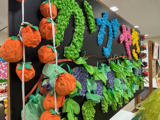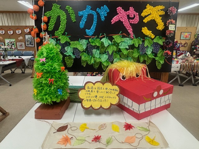 10月25・26日に菊池市文化祭の「泗水支部文化祭」が開催されました。展示部門では、デイサービス「かがやき」の利用者さんの作品も展示されました。機能訓練を兼ね、作品づくりに取り組んでこられた利用者さんの姿が目に浮かびます。