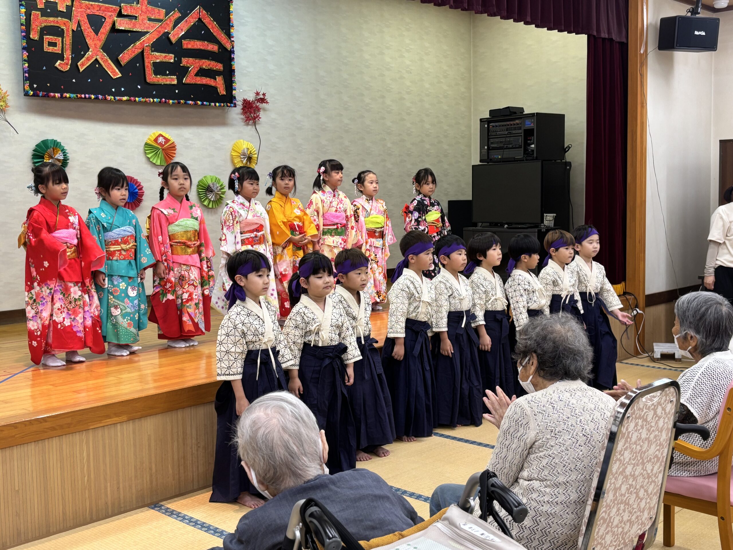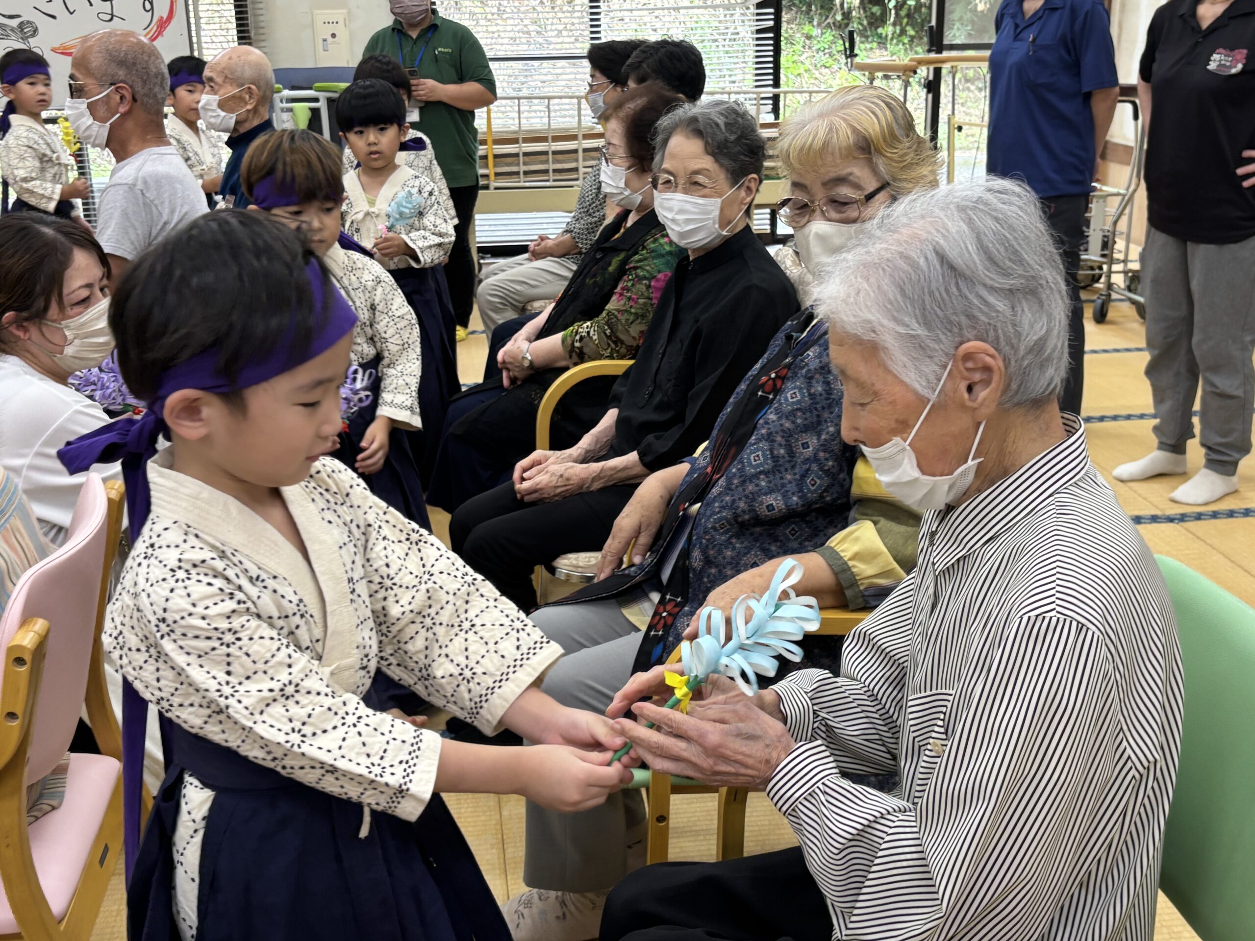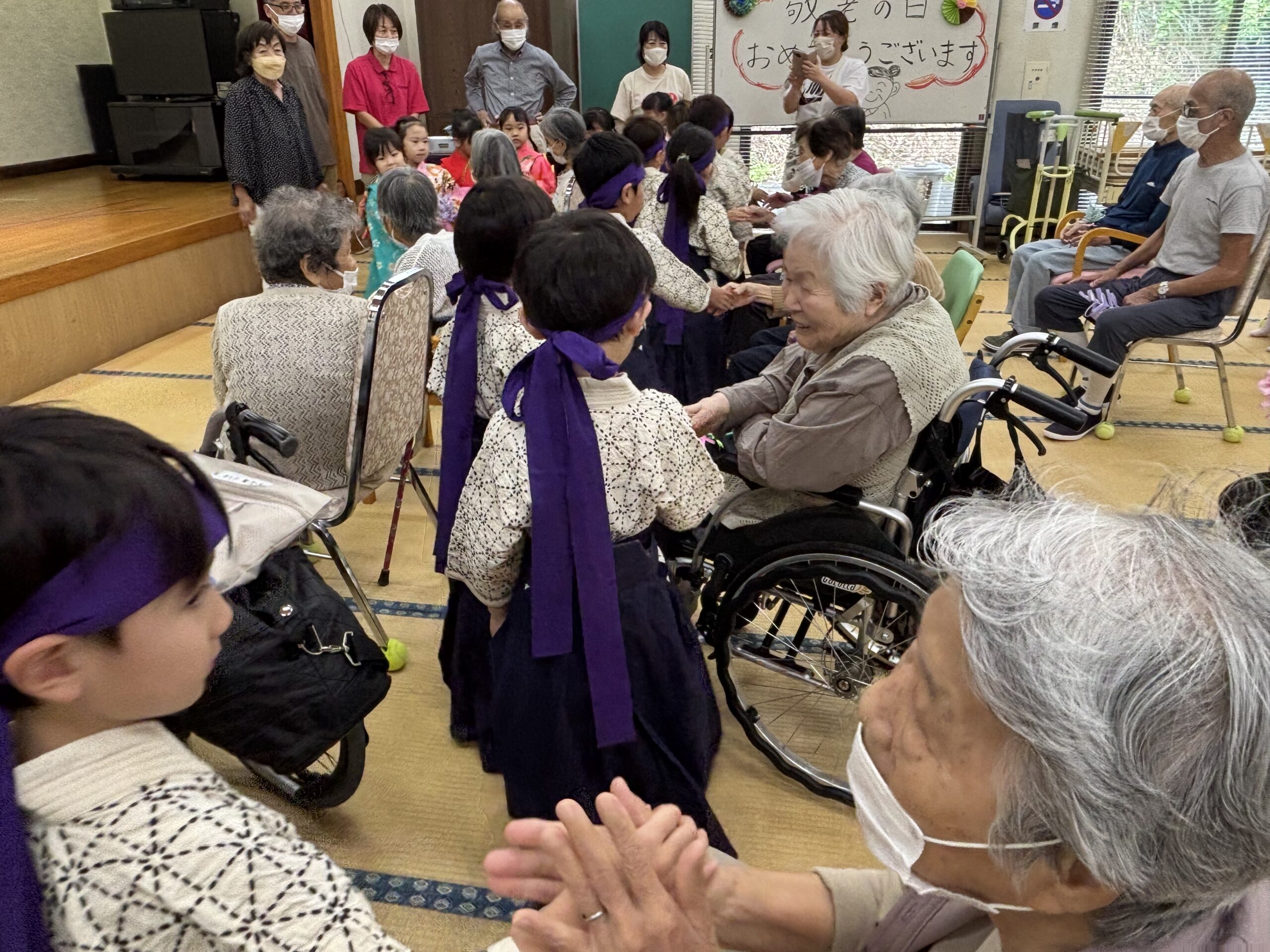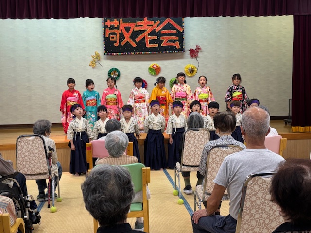 子どもたちの真剣な演舞に、利用者の皆さんは「かわいかなぁ」「きれいかなぁ」と終始目じりを下げ、大きな拍手を送っていました。子どもたちからは歌の披露もありました。