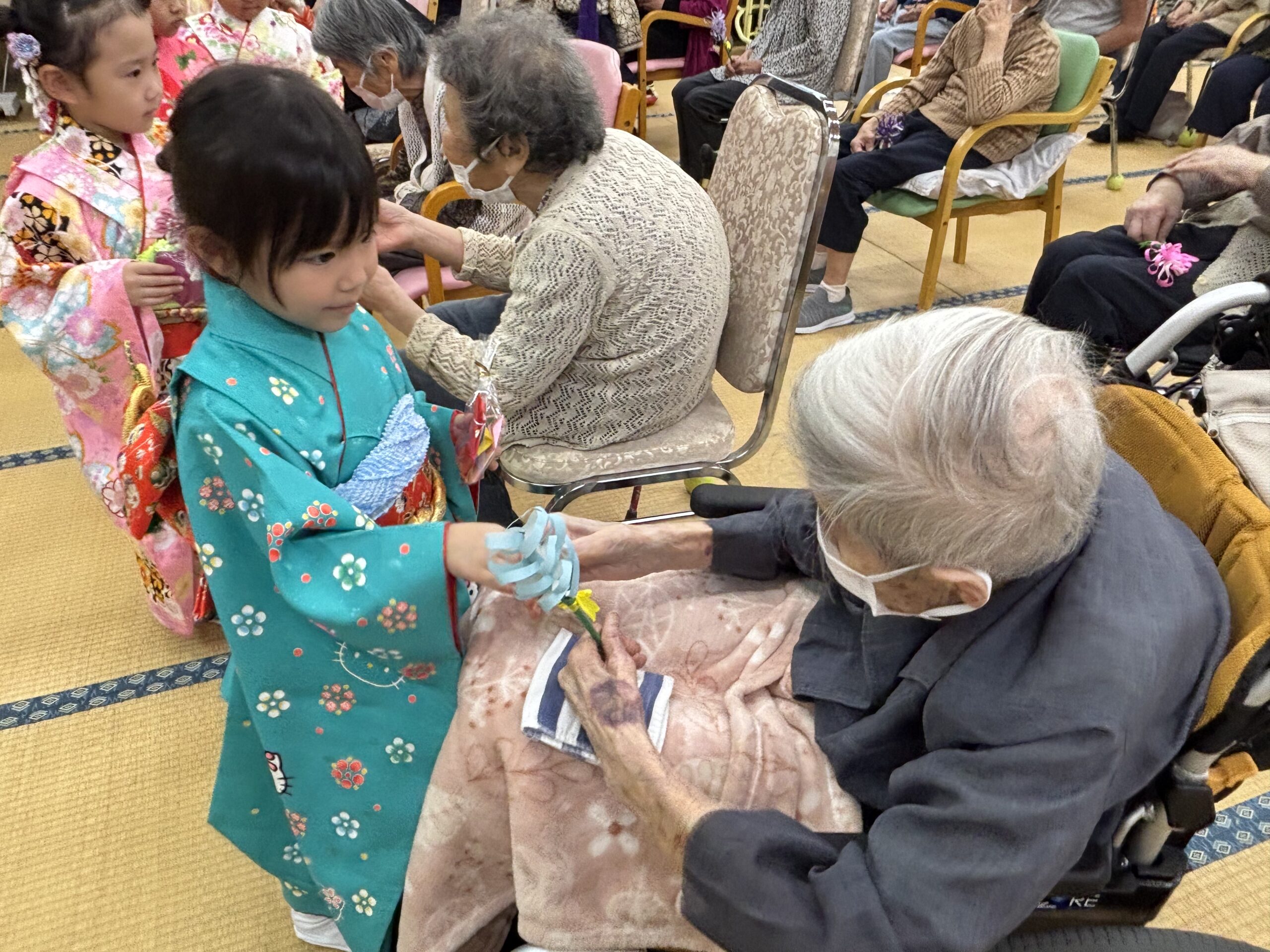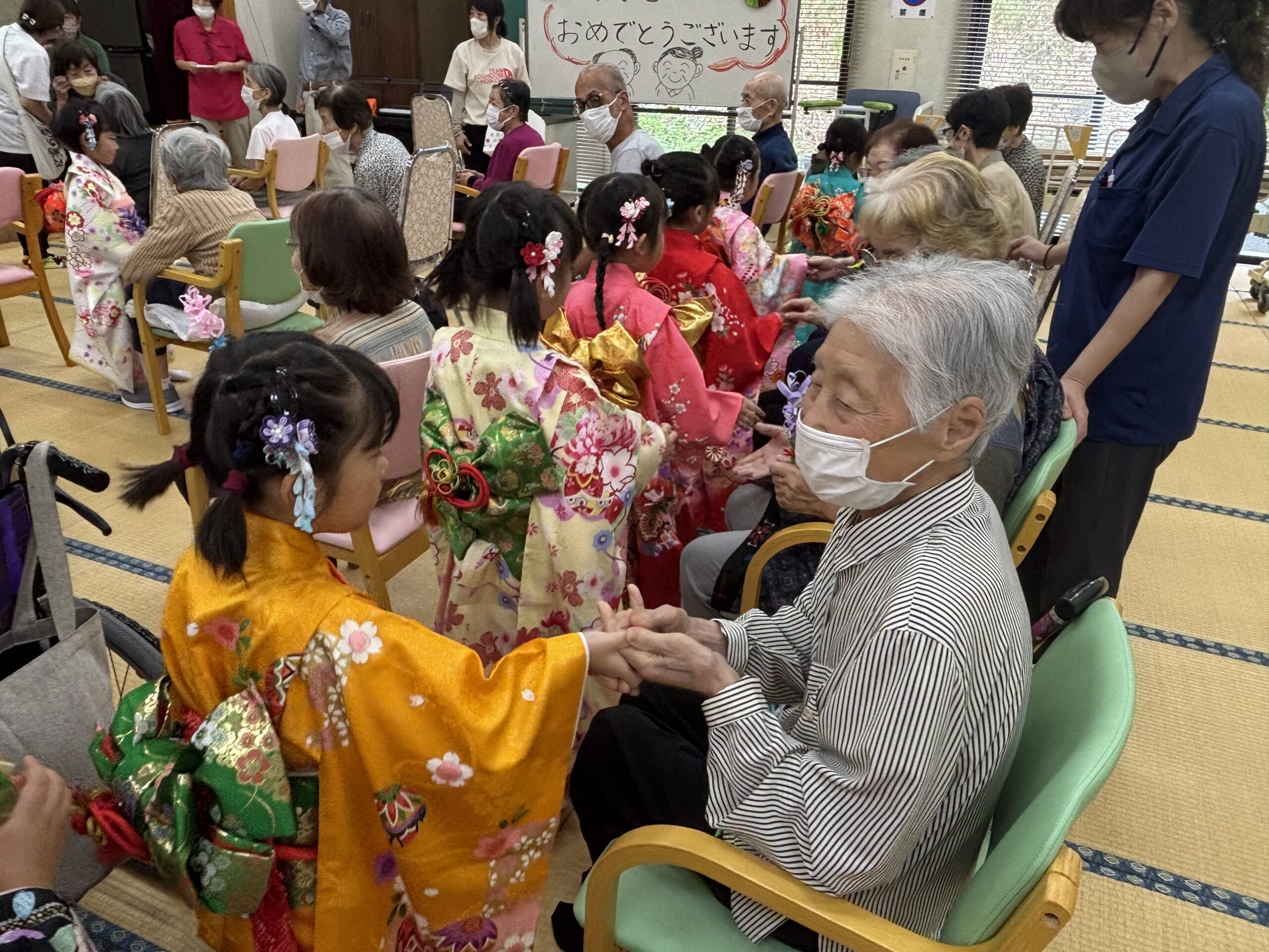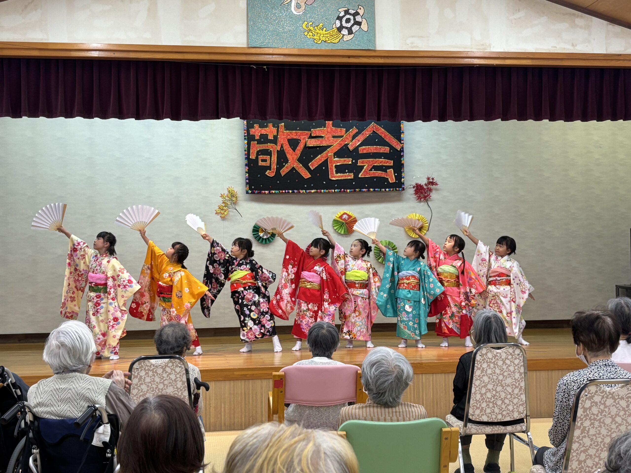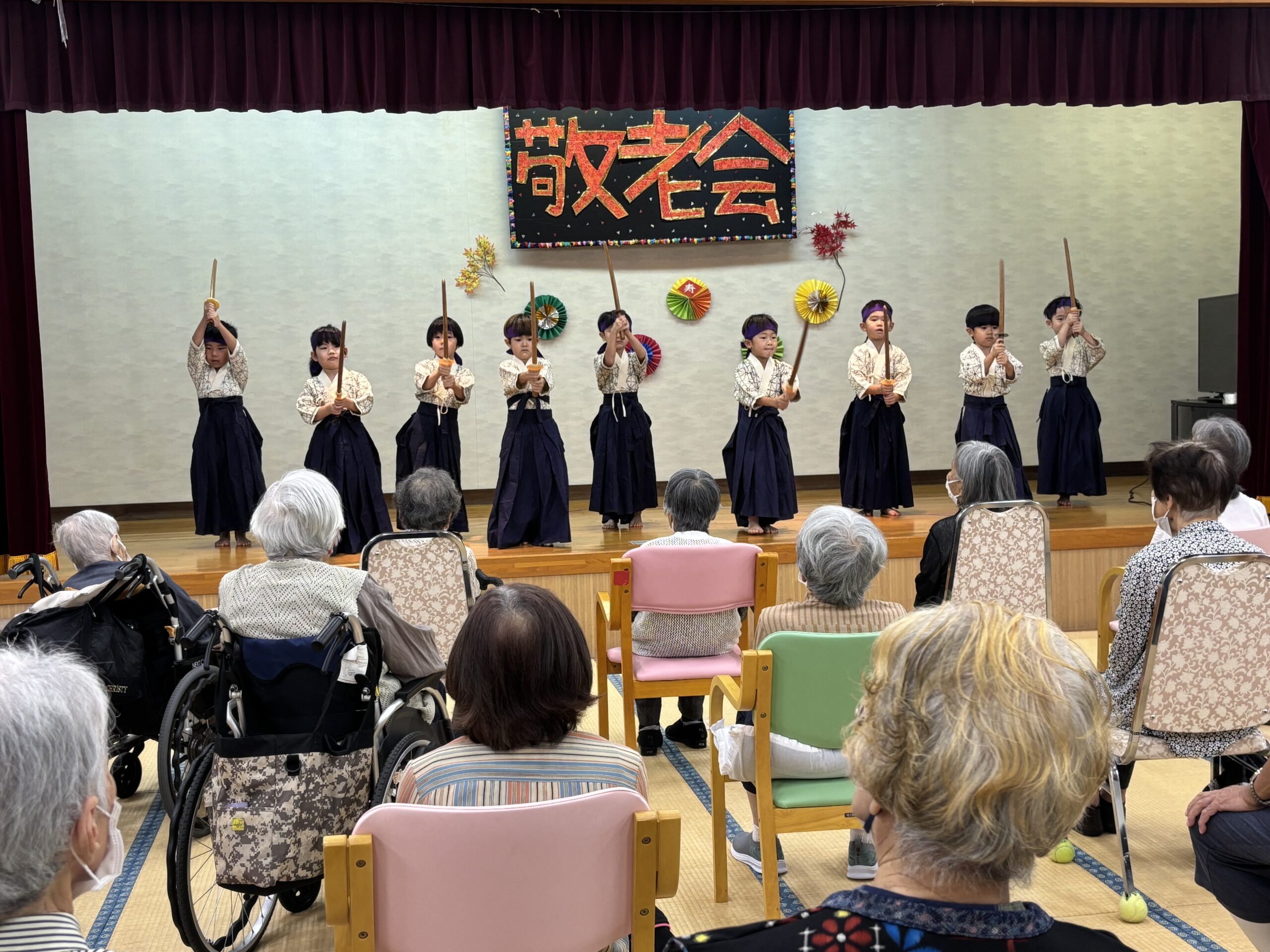 子どもたちの真剣な演舞に、利用者の皆さんは「かわいかなぁ」「きれいかなぁ」と終始目じりを下げ、大きな拍手を送っていました。子どもたちからは歌の披露もありました。