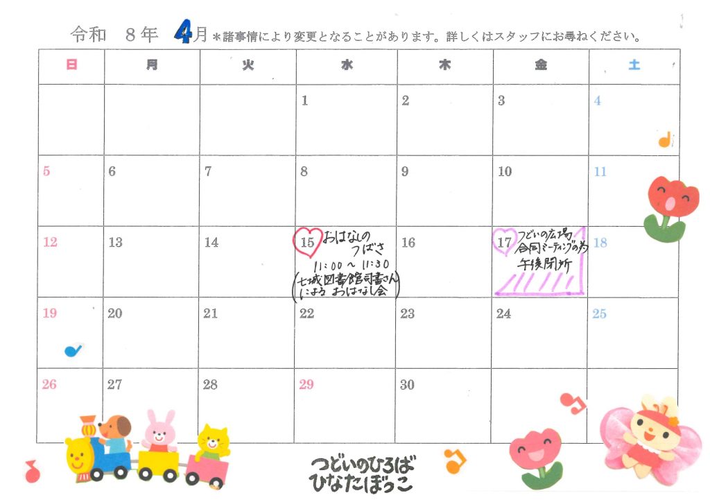 つどいの広場「ひなたぼっこ」の今月の行事予定について