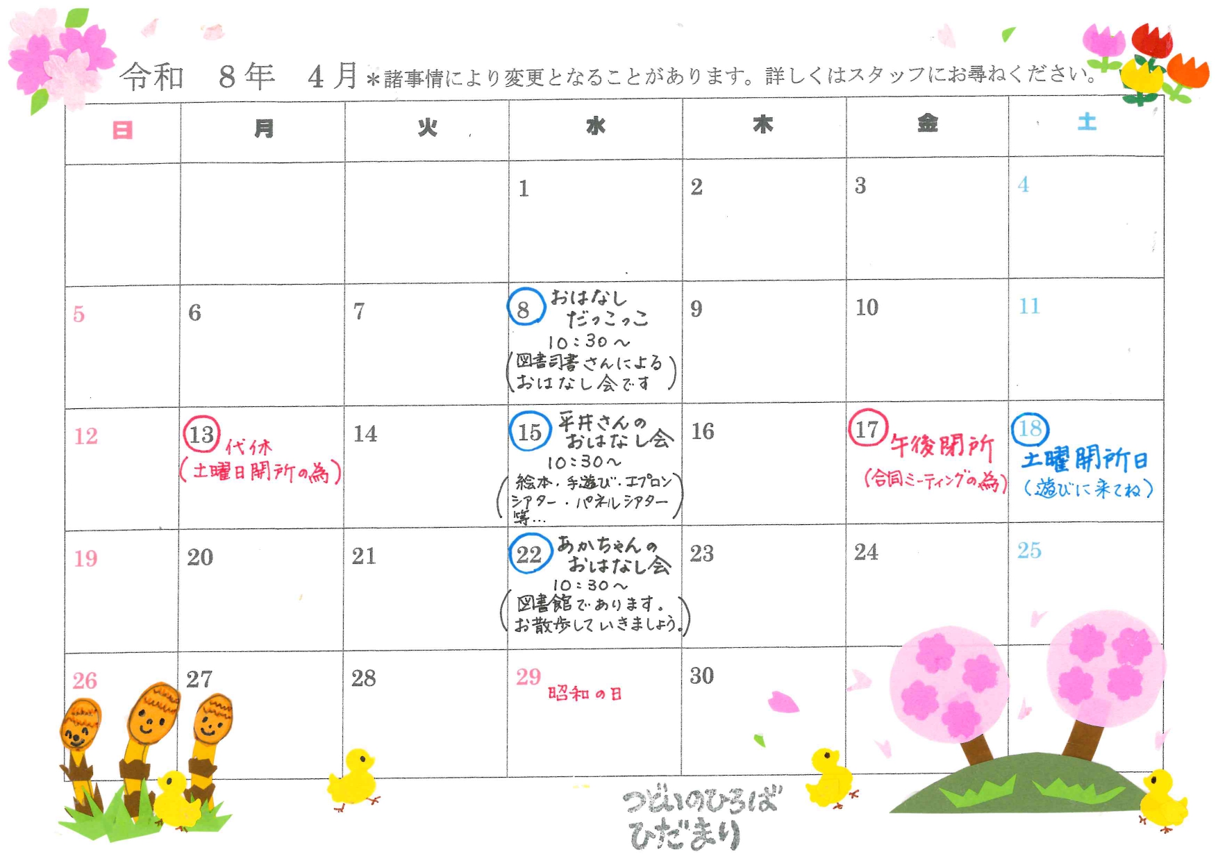 つどいの広場「ひだまり」の今月の行事予定について